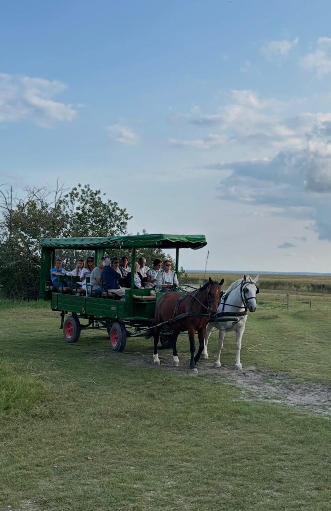 Vollbepackt mit unseren Einkäufen aus dem hauseigenen Shop ging es nach einer kleinen Rundfahrt mit kurzem Fotostopp weiter zu einer KUTSCHENFAHRT durch den Nationalpark. Vorbei an Graurindern, weißen Eseln, Lacken und Ziehbrunnen trabten die Pferde 2 Stunden weit durch den Nationalpark untermalt von kurzweiligen Infos durch den Kutscher. Immer noch begleitet von einem traumhaften Sonnenuntergang bezogen wir unsere Zimmer und trafen einander dann zur gemeinsamen Abfahrt zum Abendessen beim GRAMMEL-BOSCHA in Gols. Es wurden Benzingespräche geführt und Geschenke an die Veranstalter Stefan und Marion überreicht. Beendet wurde der erste Tag in lustiger Runde bei den Veranstaltern im Kellerstüberl. Prost!